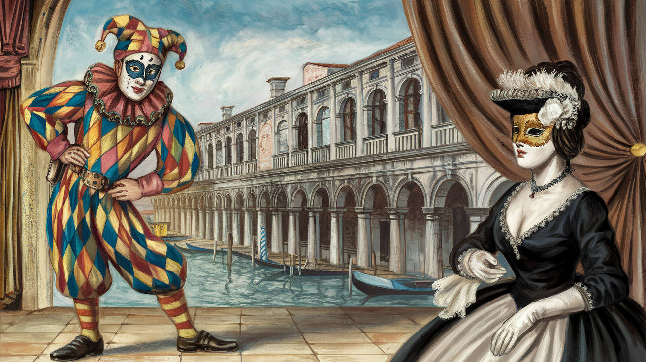 Le Carnaval de Venise doit beaucoup à l’influence de la Commedia dell'Arte, cet art théâtral italien né au XVIe siècle. Parmi ses figures les plus célèbres, Arlequin brille par sa personnalité espiègle et son costume reconnaissable entre mille. Ce valet rusé, souvent affamé et toujours prêt à jouer un tour, porte une tenue ornée de losanges multicolores, symbolisant à la fois sa joie de vivre et sa condition modeste. Derrière son masque noir se cache un personnage profondément humain : rusé mais vulnérable, drôle mais mélancolique. Une dualité qui résonne encore aujourd'hui dans les ruelles animées de Venise.